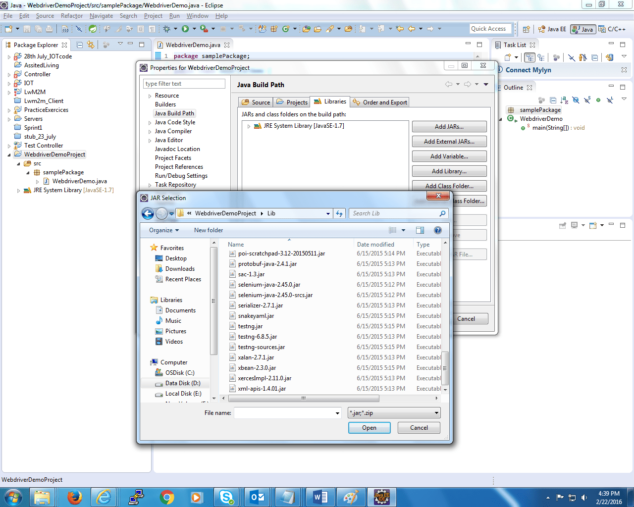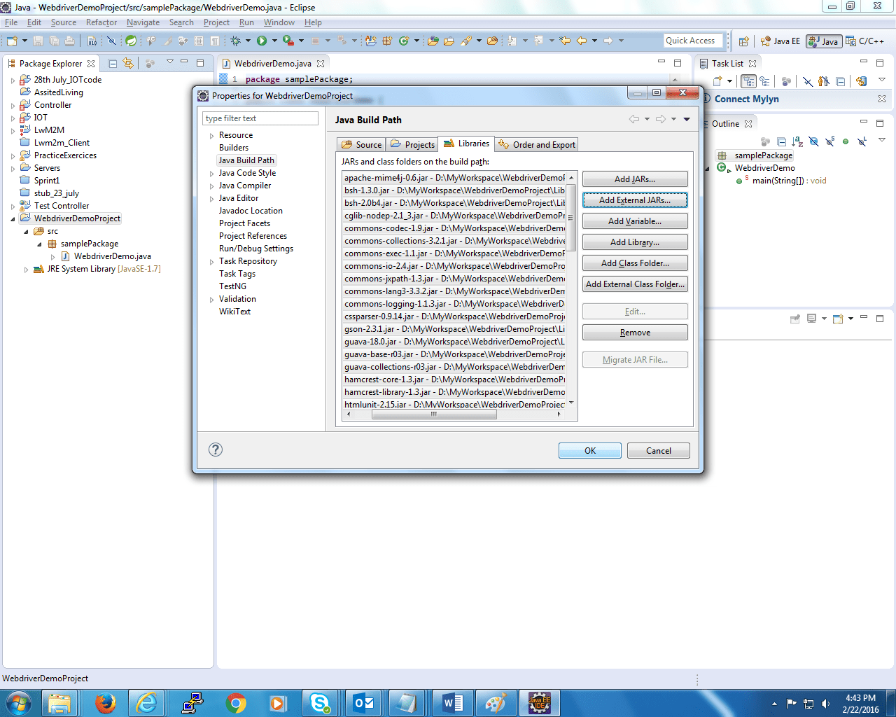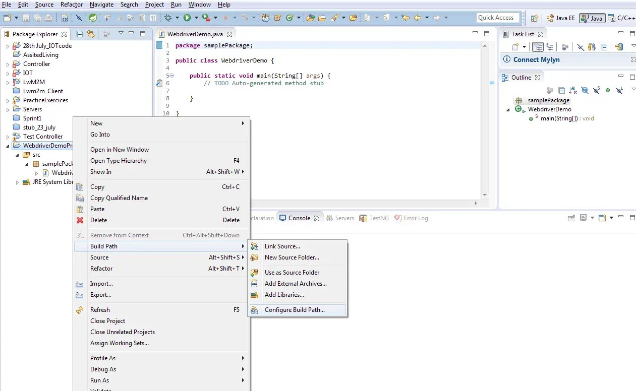 Right-click on the project “WebdriverDemoProject.” Select Build Path->Configure Build Path.