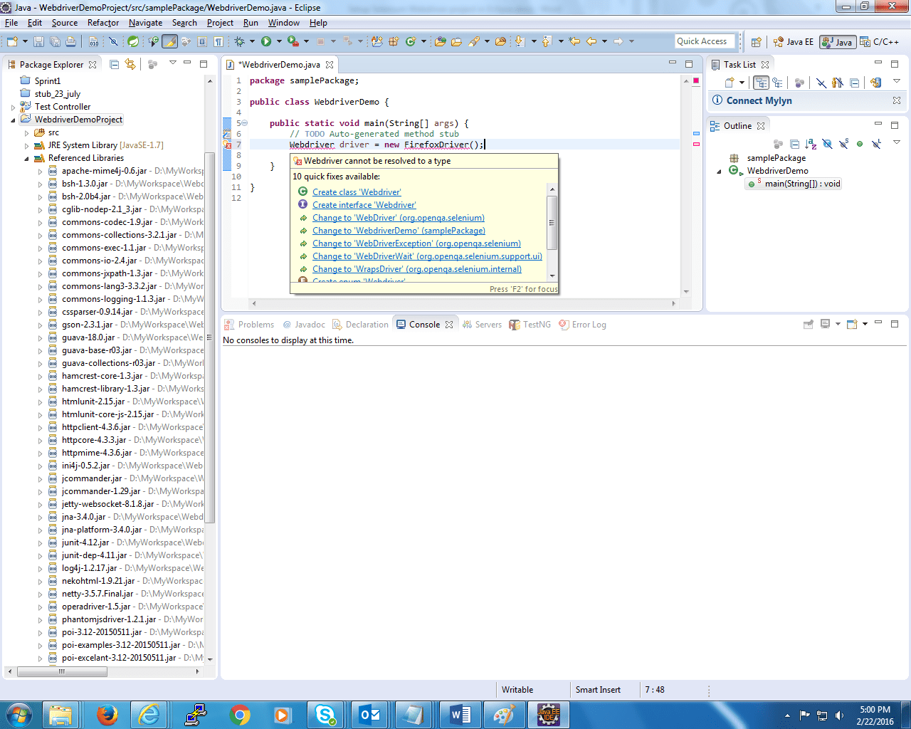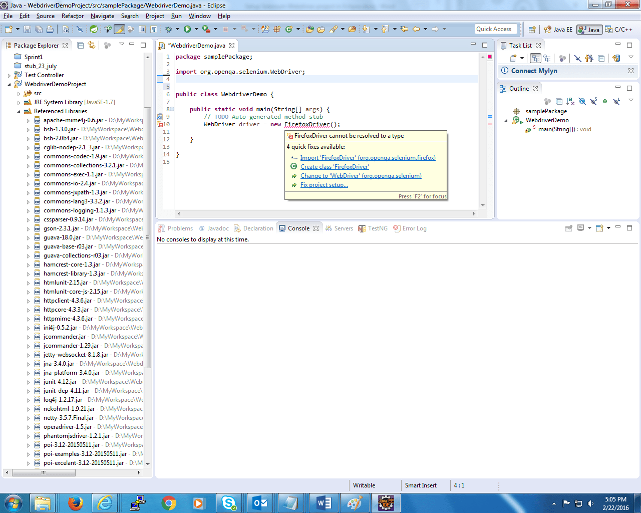 - Eclipse IDE brings in the auto-suggest feature, which is quite handy in determining the Selenium Webdriver methods and their parameters. When you add the first line of code to create a Webdriver object like the example shown in the snapshot.