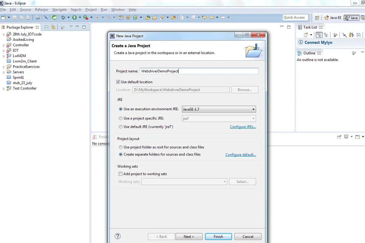 Step#2: Enter the name of the project Eg-WebdriverDemoProject
