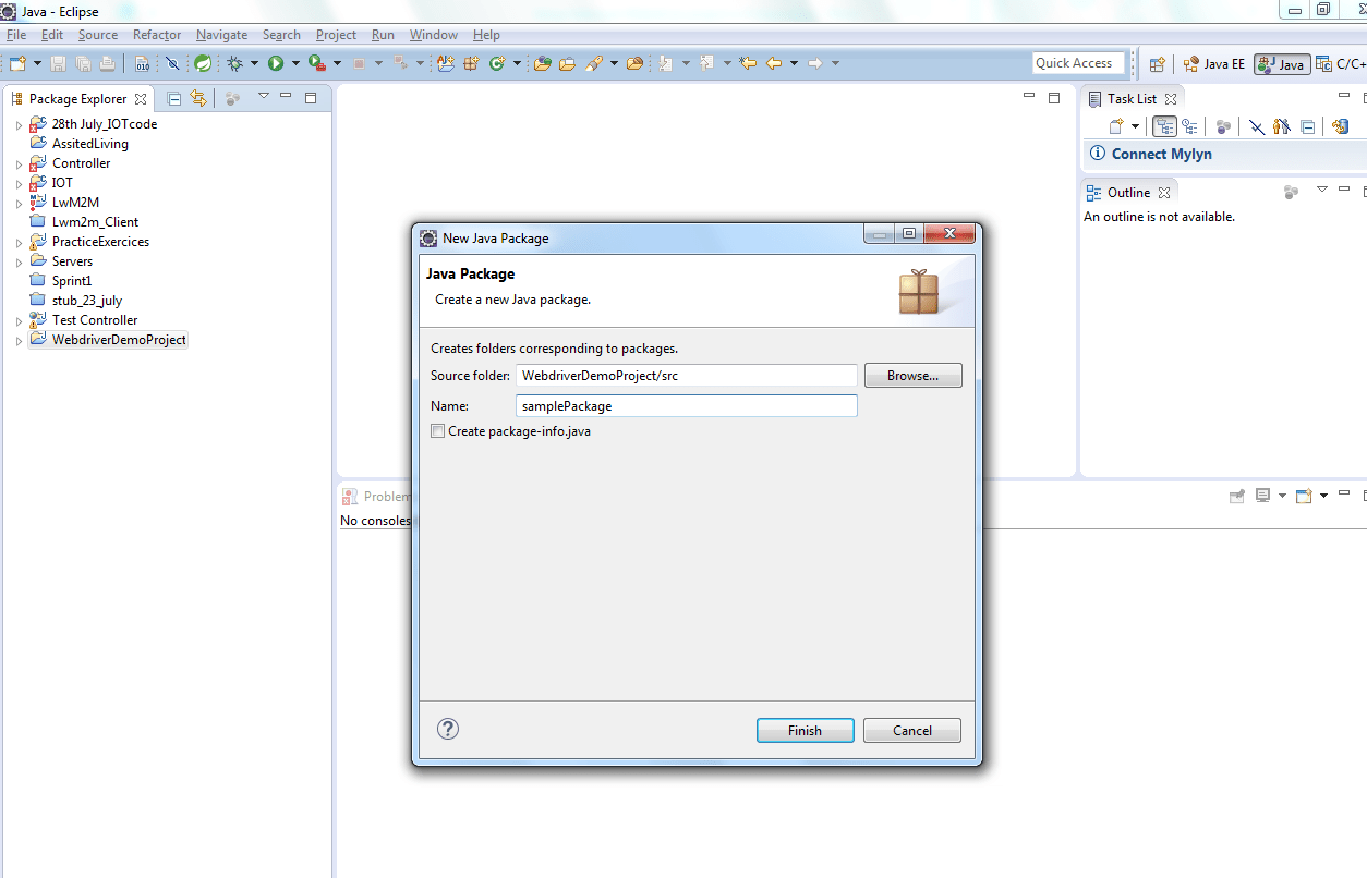 Give the name of the package, e.g. “<samplePackage>” and click on Finish