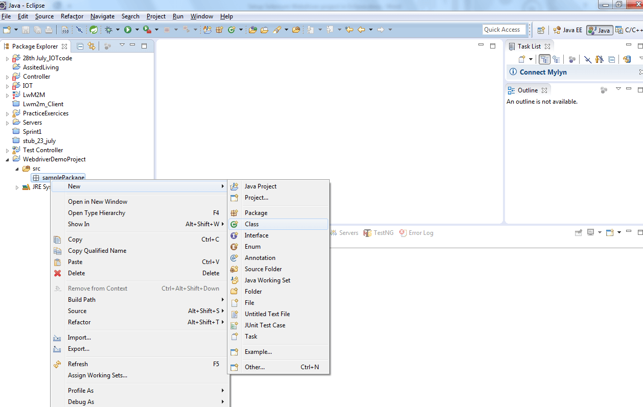 Right-click on the newly created package to create a Java class as New->Class.