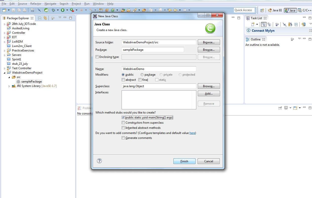 Select the checkbox for “public static void main (String[] args)” and click on Finish.