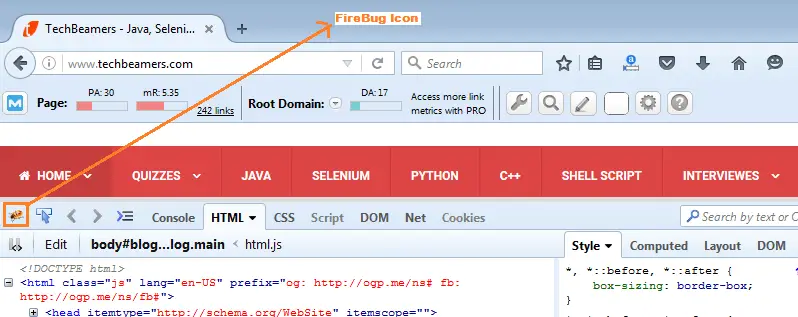4- After finishing the FireBug installation, you can use the “F12” shortcut key to launch the FireBug add-on. Check out the below screenshot.