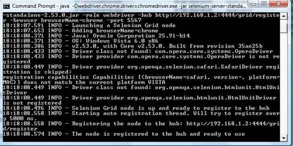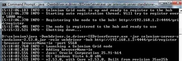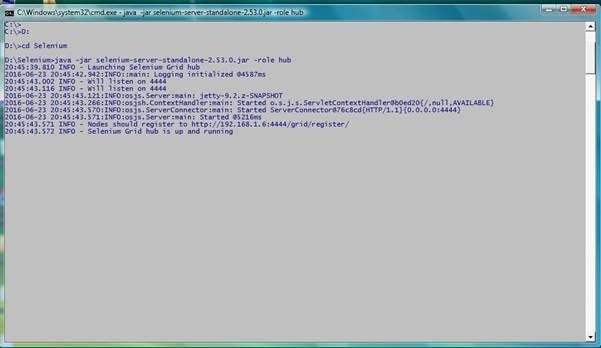 D:\>java –jar selenium-server-standalone-2.53.0.jar -role webdriver –hub http://192.168.1.6:4444/grid/register -port 5566- On running the command, the command prompt should be similar to the image below.