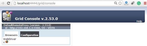 We can verify whether the hub setup in the above step is running successfully or not by using a browser. Selenium Grid, by default, uses Machine A’s port 4444 for its web interface. Open up a browser and go to http://localhost:4444/grid/console.
