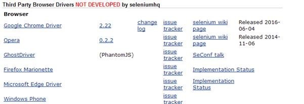 To download the Chrome driver, open SeleniumHQ site and go to its download section. After that, navigate to Third Party Browser Drivers area and click on the version number <2.22> as shown below.