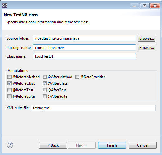 2. Assign a proper name to the class. And select the required methods. Also, specify the name of the <testng.xml> file as shown below.