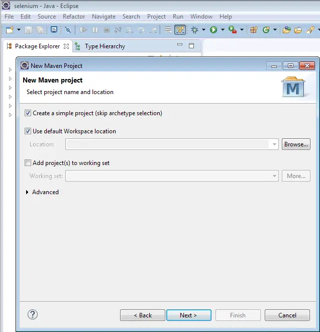 1. Open Eclipse and right-click on Package Explorer. Select New >> Maven project. Click the Next button.