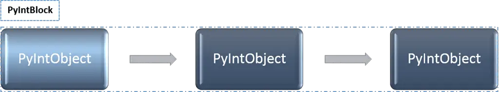 Once a block’s integer object pool gets depleted, a new block becomes available to fulfill the new requests for integer objects. All these blocks are chained together in the form of a single linked list.
