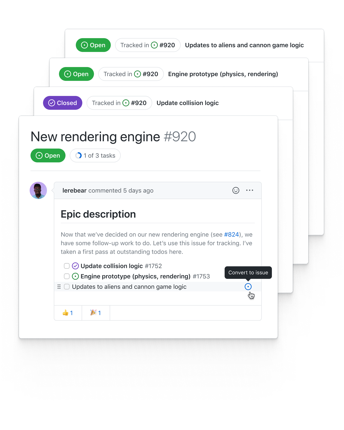 Tackle complex issues with task lists and track their status with new progress indicators. Convert tasks into their own issues and navigate your work hierarchy.
