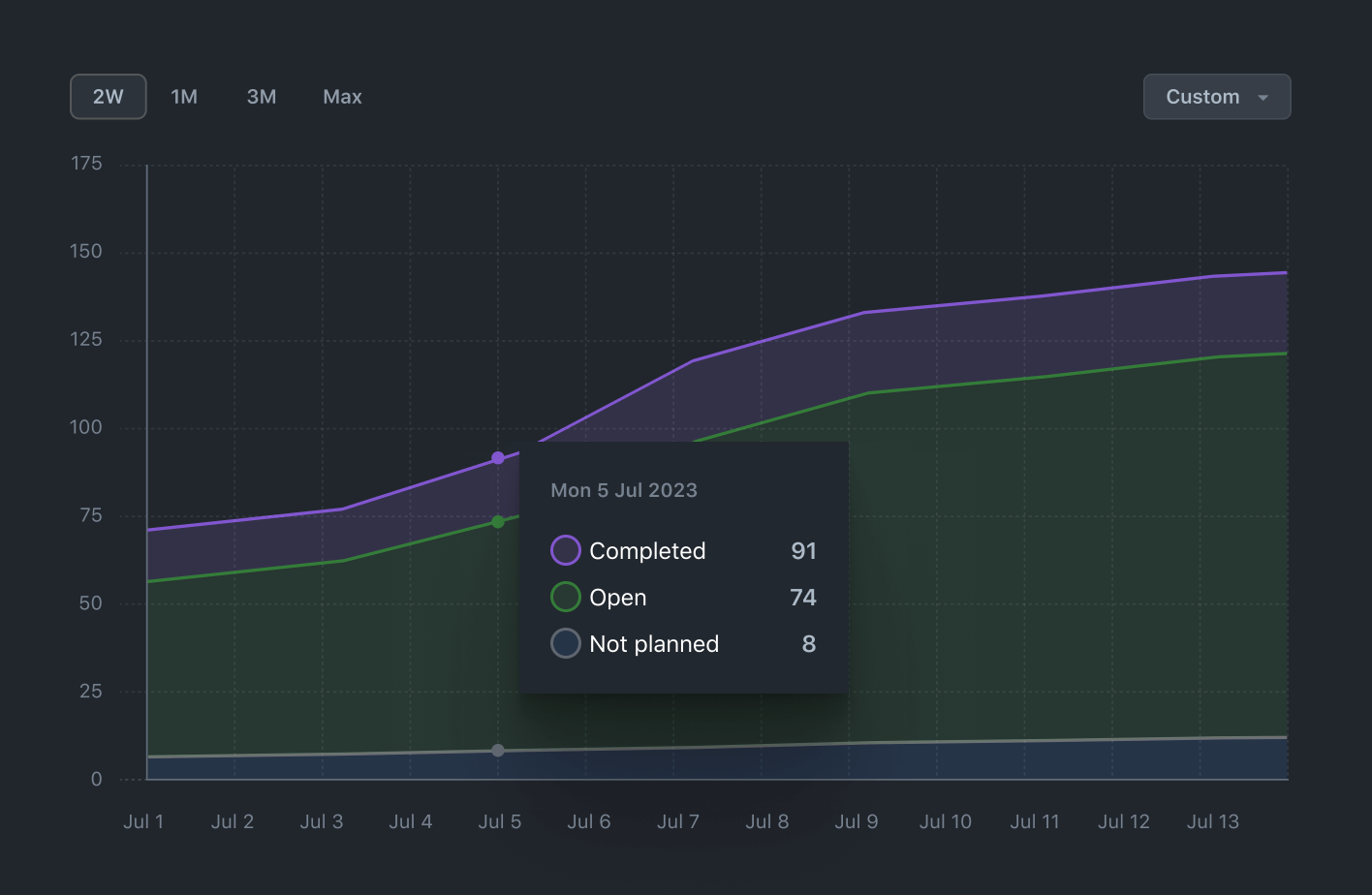 Track the health of your current iteration cycle, milestone, or any other custom field you create with new project insights. Identify bottlenecks and issues blocking the team from making progress with the new burn up chart.